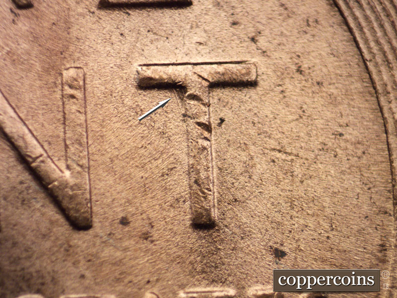 Die gouge from R in PLURIBUS. Die gouge across second U in UNUM. SE die scratches in E of ONE Die gouge in upp T in CENT. Concentric die scratches though second T in STATES and IC in AMERICA.