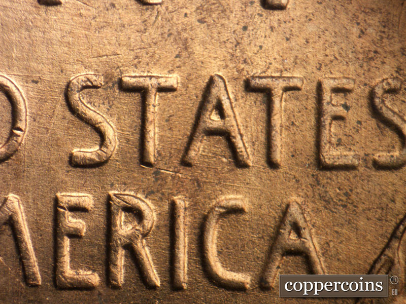 Reverse die changed. Multiple short die scratches through UNUM. ESE die scratches through STAT in STATES. SE die scratch through F in OF.