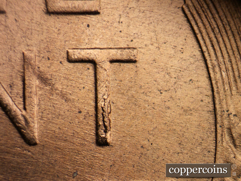 Crossing die scratches between dot and first U in UNUM. Die break on T in CENT. SE die scratch from O in OF. E/W die scratch from lower C in CENT to ward left wheat stalk.