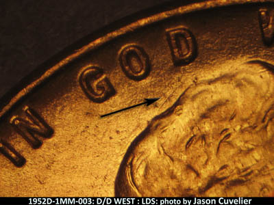 Diagonal SW-NE die scratch below GOD; curving NW-SE die scratch below TRU of TRUST; die chip at base of the 9.