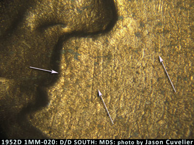 Part of the lower bar of the D can be seen seen south of the primary mintmark.