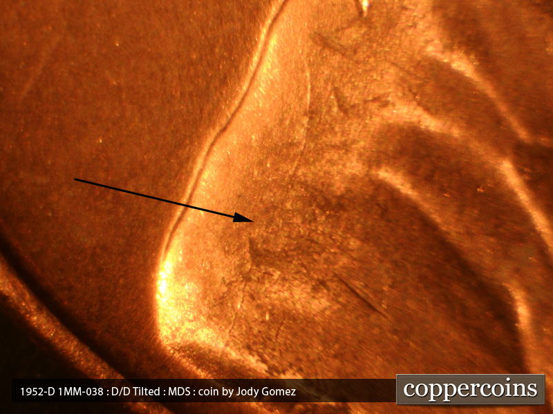A die crack is beginning to form from the tail of the 9 to the mint mark. A die crack runs up the back of the shoulder. A die crack at the rear of the forehead into the hair.