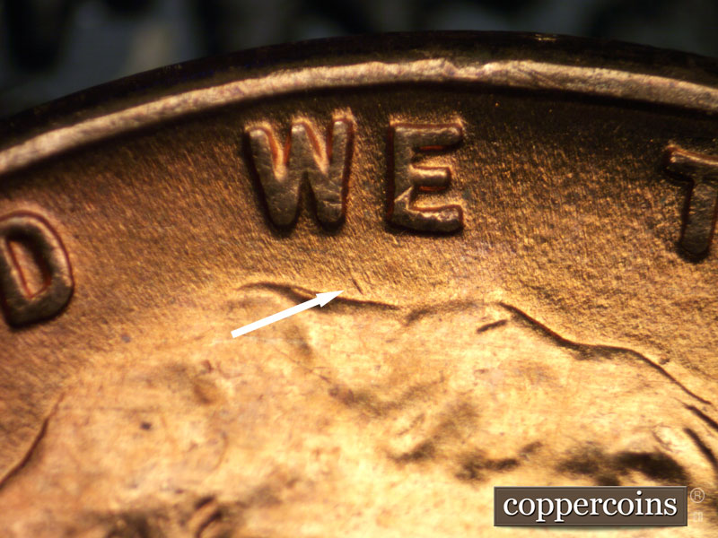 Die break from bottom of 9 in date to mintmark. Die clash behind neck. Short NW die scratch from top of hair toward W in WE. SW die scratch from bottom of ear. Reverse is LDS