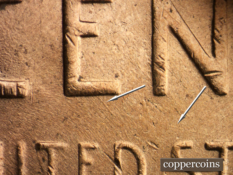 SE die scratches through PLURIBUS. ESE die scratch from C in CENT. ESE die scratch from lower T in CENT.