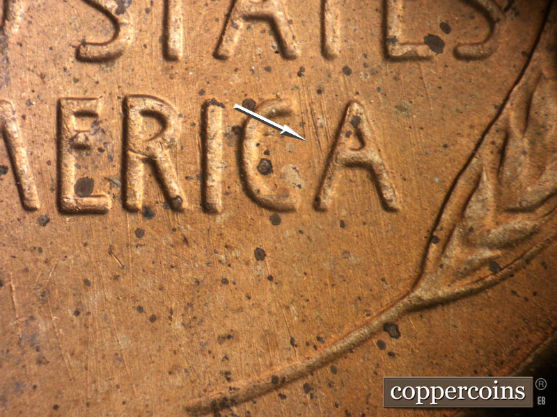 Generally N/S die scratches cover reverse, see photos for exact configuration. Heavy path of die scratches between CA in AMERICA
