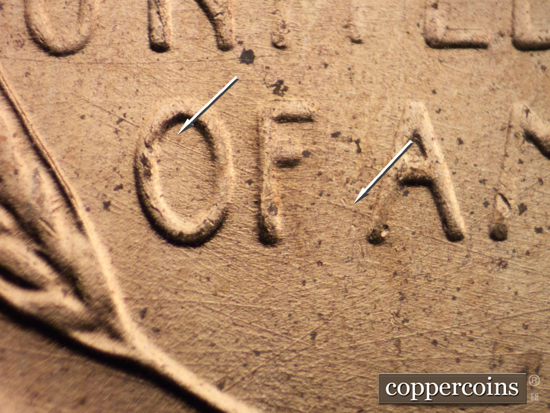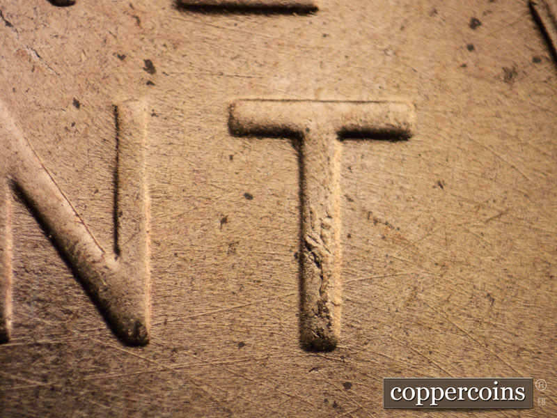 A die crack on the T of CENT. A NW-SE die scratch through the O of OF. Die scratches under CENT.