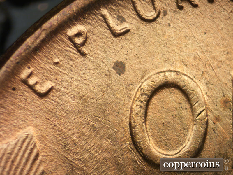 NW die scratches between left wheat stalk and O in ONE. NW die scratches from top of N in ONE. SE die scratch in field east of E in ONE. Die scratch in upper T in CENT. Heavy SE die gouge under A in STATES. Curved die scratch in C of CENT.