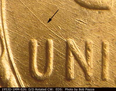 Heavy parallel die scratches run E-W between the O and N of ONE. A horizontal V shaped die scratch from the top of the left wheat to the C in CENT. A long die scratch runs NW from the N in UNITED. Reverse is MDS.