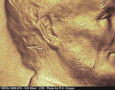 Fading die scratches east of ear and on neck in a different direction. Circular die scratches behind head above LIBERTY and a few stronger ones by neck.