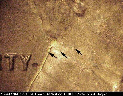 Tripled repunched mintmark shows as split serifs and an extra marking on the upper curve. NOTE: RPM is farther South than 1953S-1MM-019 and in a different direction. Could easily be confused.