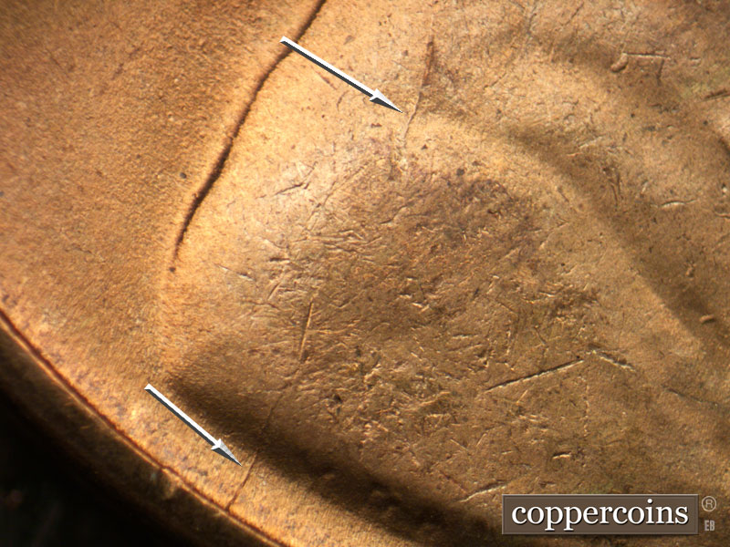 An area of heavy die scratches in and around the C of CENT. E-W die scratches to the east of the E of ONE and the T of CENT. Reverse is MDS.