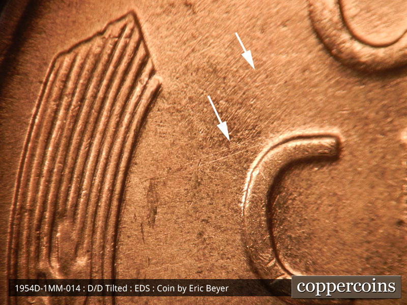 Parallel die scratches upper left C of CENT, die scratches through STATES and AMERICA