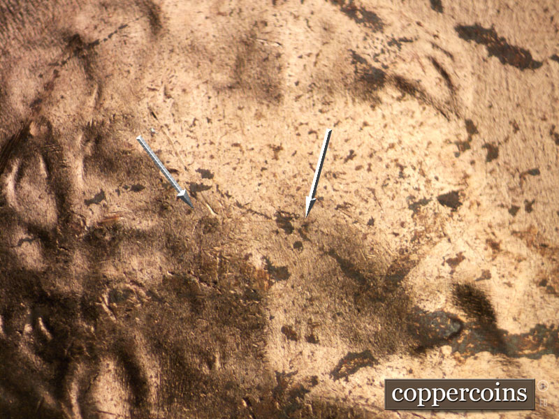 SE die scratches un O in ONE. SE die scratches inside C of CENT. SE die scratches to upper T in CENT.