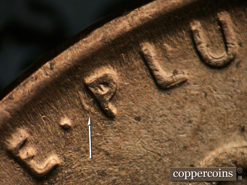 Die gouge be P of E PLURIBUS. NW die scratches from left wheat stem through OF.