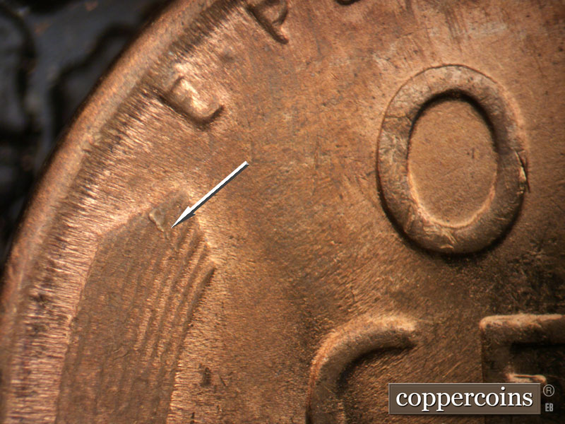 Parallel NE-SW die scratches below the last A of AMERICA. A die ding sits just to the left of the upper T in CENT. Parallel SW-NE die scratches from the top of the T in CENT. Pair of die gouges by left wheat stalk