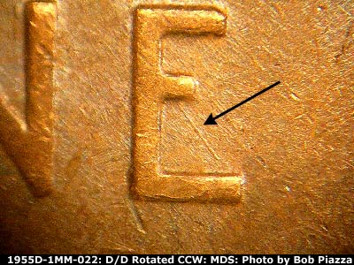 Splits can be sen on both serifs of this rotated repunched mint mark.