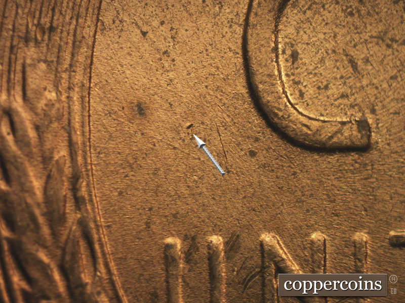 NW die scratches from C in CENT to left wheat. ESE die scratch from lower T in CENT. SSE die scratches from OF to left wheat stem. Die dot between C in CENT and left wheat stalk.