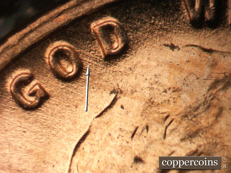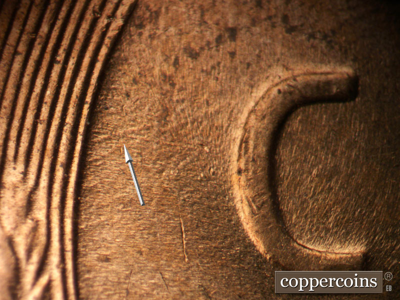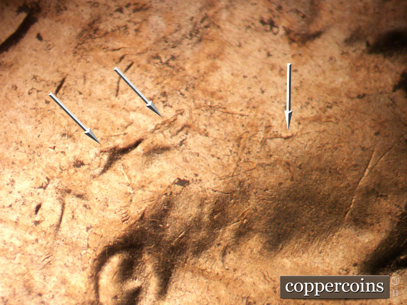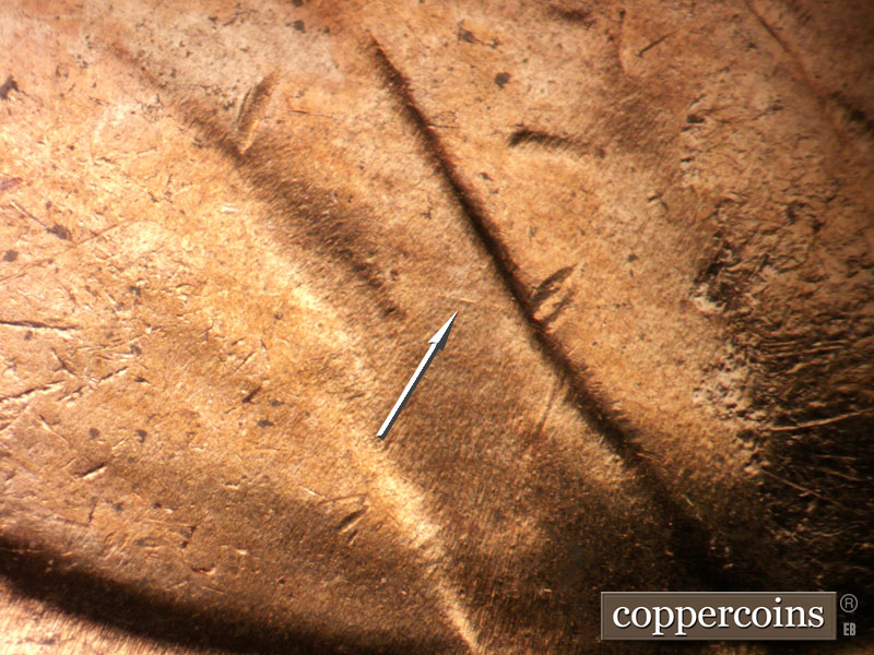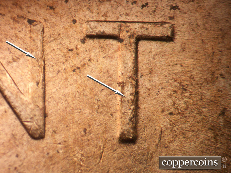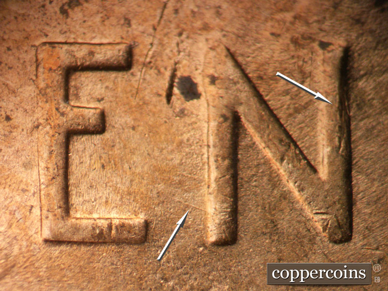 Die chips on T in CENT and N in CENT. WNW die scratch from N in CENT. ENE die scratches from left wheat.