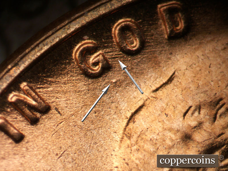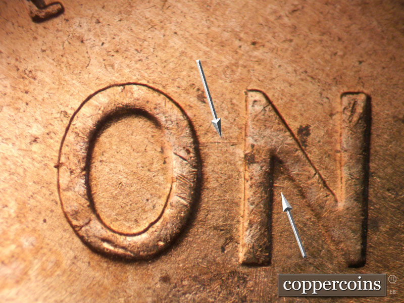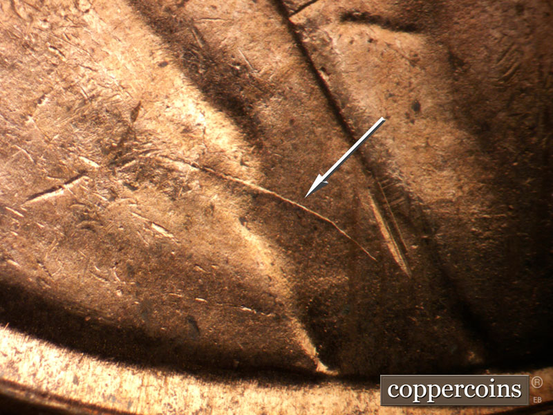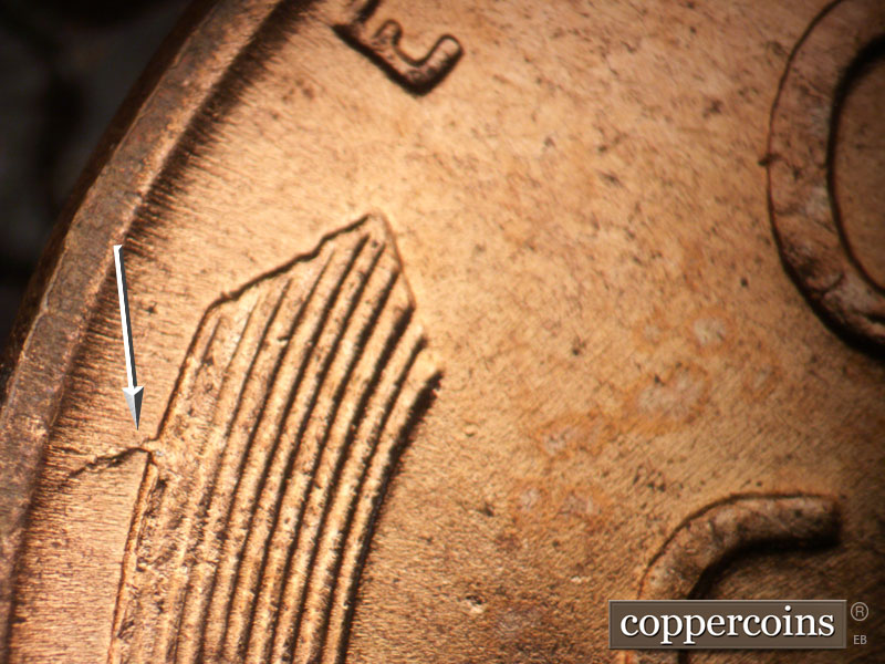 Die crack from left wheat stalk to rim. E/W die scratch connects ON in ONE. NE die scratches from last A in AMERICA to last S in STATES.