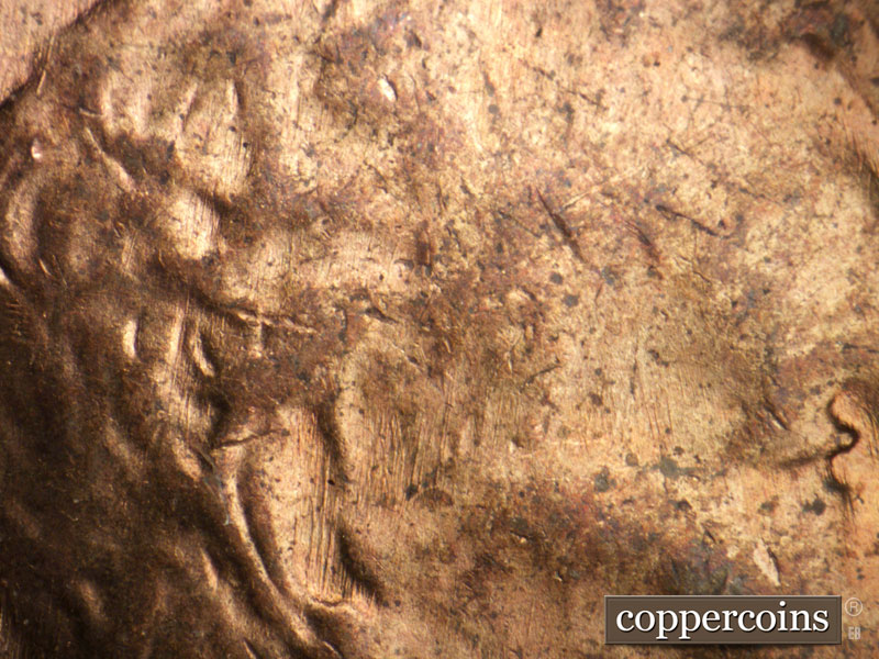N/S die scratches between lapel and date. N/S die scratches through LIBERTY. N/S die scratches in ear. Concentric die gouges between WE TRUST and rim. Reverse is MDS