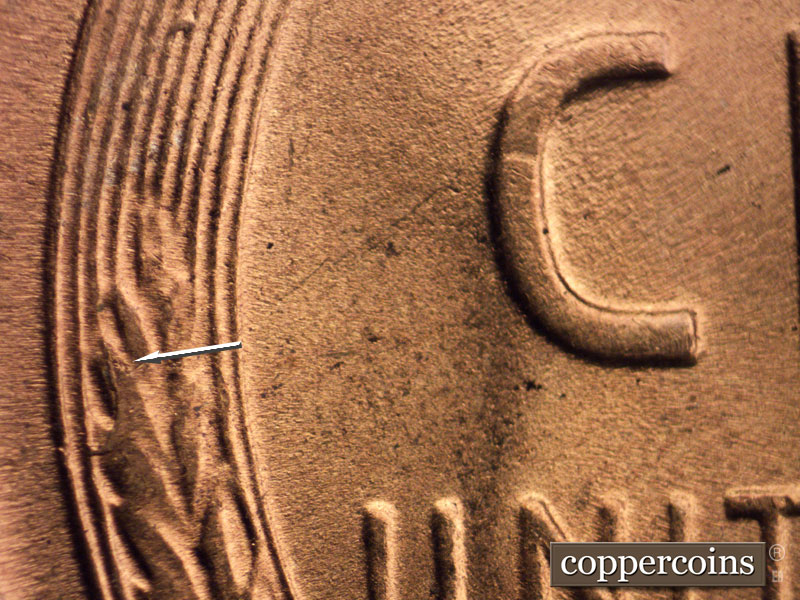 Die dot between E in ONE and M in UNUM. Die break in T of CENT. Die crack from right wheat to rim. Die break left wheat.
