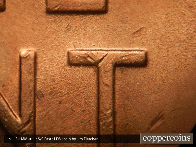 Die gouges occur from the left wheat tip, between the E & P, and also between the L & U of EPU. A die crack extends from the rim to the base of the right wheat ear and extends up into the wheat grains.