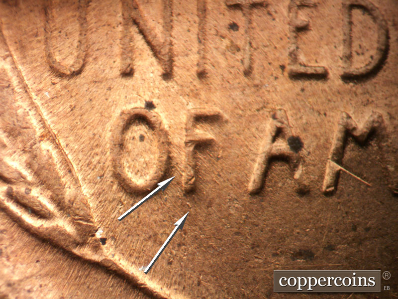 SE die flow in lower E of ONE. Small die chip under F in OF.