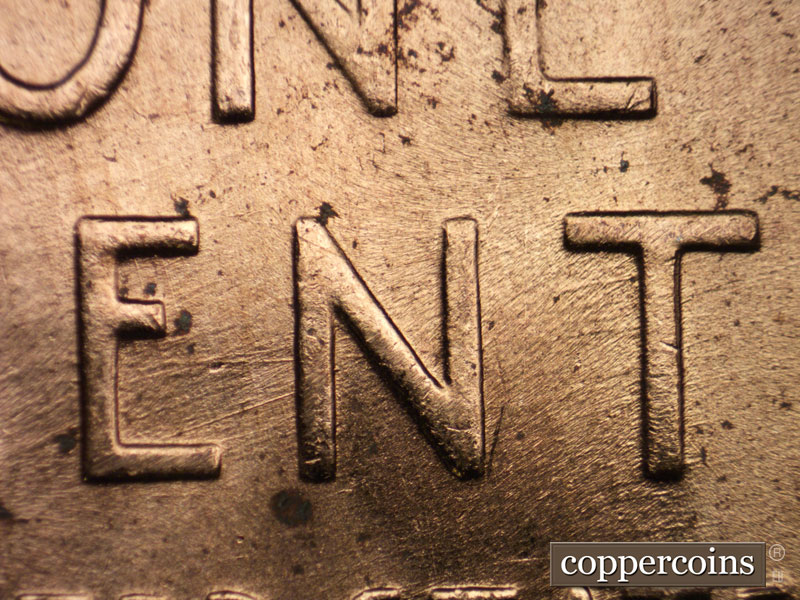 ESE die gouge from rim above left wheat stalk. NNW die scratches from top of N in ONE. E/W die scratch between EN in CENT. ENE die scratches through STATES and UNITED. V shaped die scratch from N in UNITED toward C in CENT.