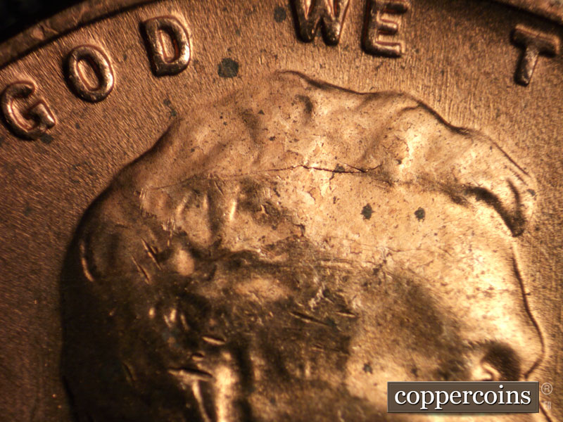 Small die gouge between CE in CENT. Small die break on base of T in CENT. SE die gouge under O in OF.