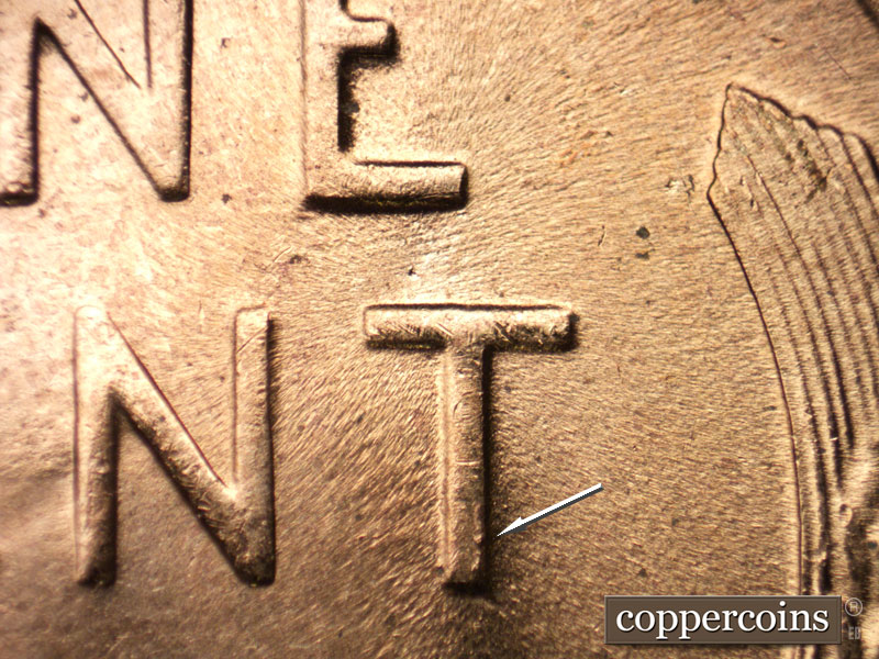 Die break in lower T in CENT. Multiple die breaks in left wheat, see pictures for exact locations.