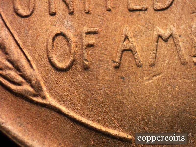 Heavy NW die scratch from N in ONE. NW die scratches through UNITED. Heavy NW die gouge from upper tip of I in AMERICA.