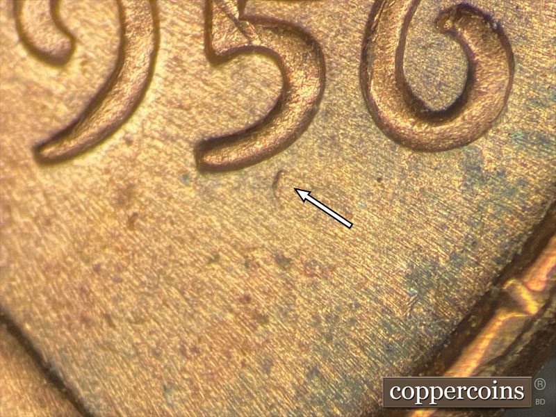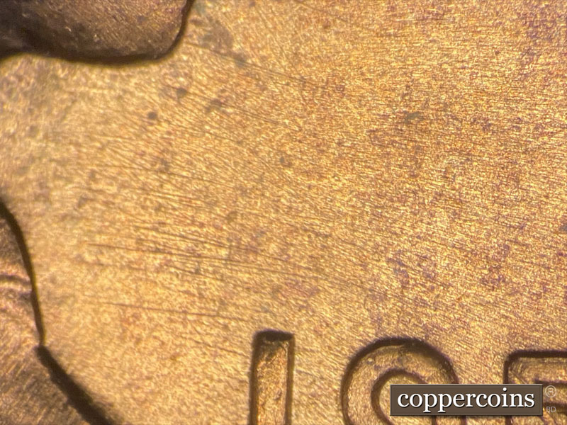 E/W die scratches can be seen running outside along the front of lincolns face down under his chin. Multiple die cracks can be found in lincolns hair. Die gouge can be seen below the 5 of the date. A die gouge can be found in the fold of lincolns lapel. A die gouge can be seen just east of lincolns eye.