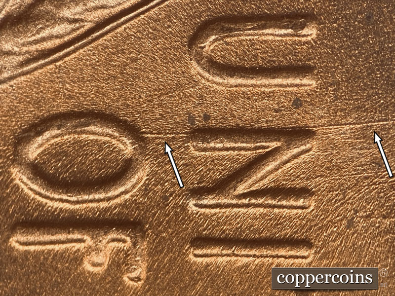 Die scratch can be found just N/E of the eye. A die scratch can be seen running S/E through the E of LIBERTY. Multiple die scratches can be found behind licnolns neck.A die scratch can be found along the rim above GOD. A die scratch can be found in between the bottom two points of W in WE.