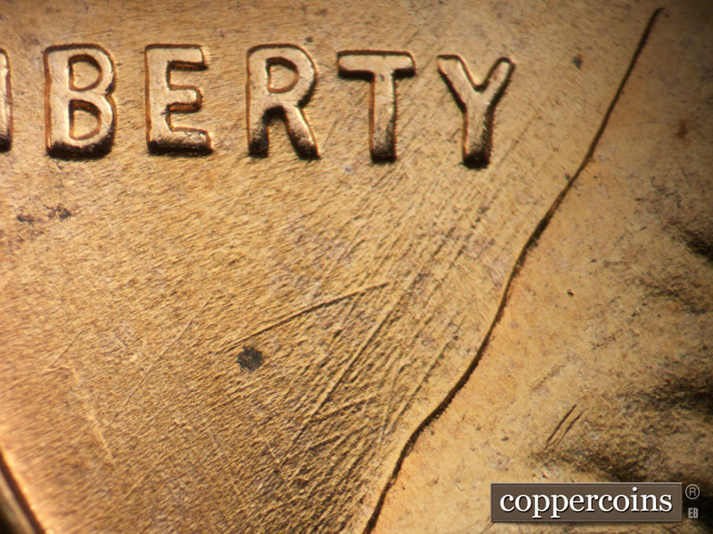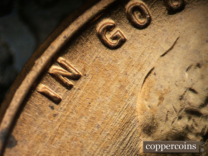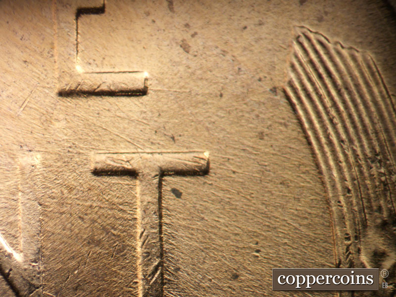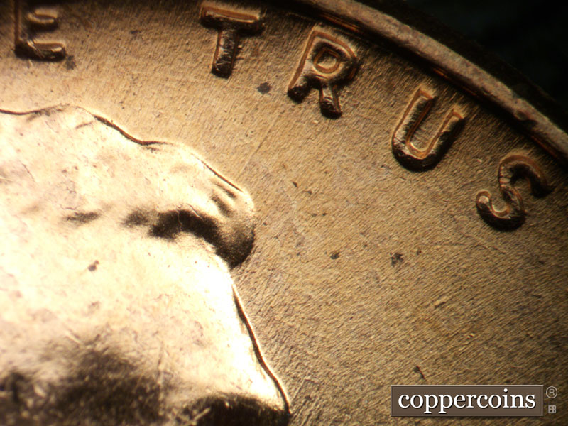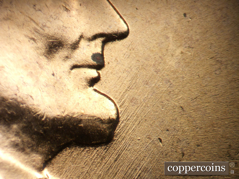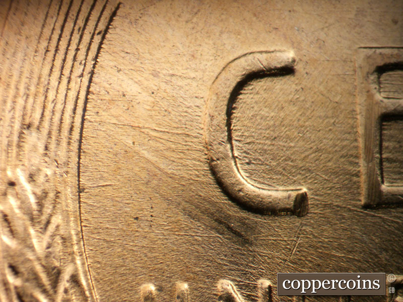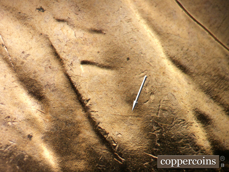Short E/W die scratch west of 1 in date. E/W die scratch on lapel. Shor NE die scratches from back of shoulder. NE die scratch through E in WE. Intersecting die scratches in front of forehead. Reverse is MDS.