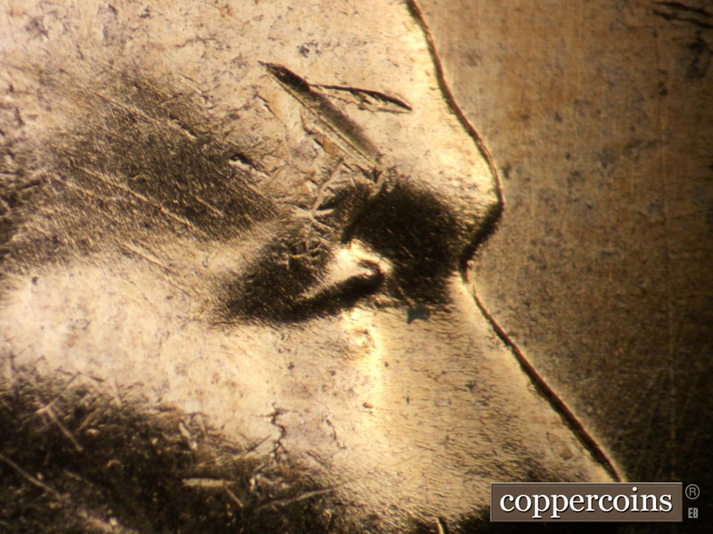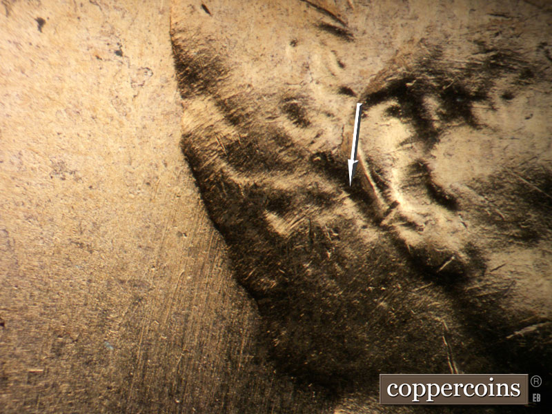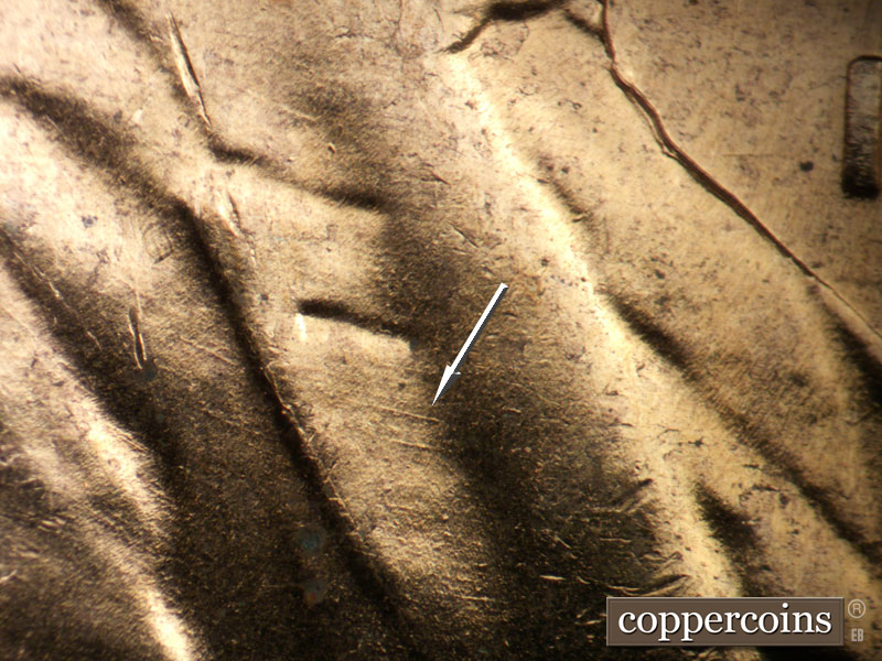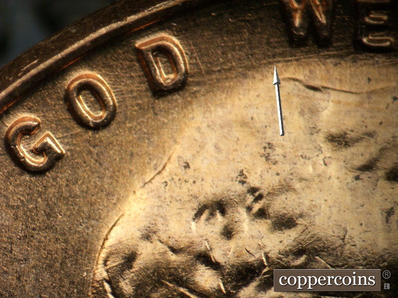 Die clashes near date. WNW die scratch on lapel. NNE die scratches cover most of obverse, see photos for exact configuration. ENE die scratch connects D in GOD to W in WE. Concentric die scratch through TRU in TRUST. Reverse is MDS