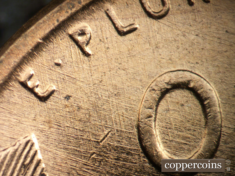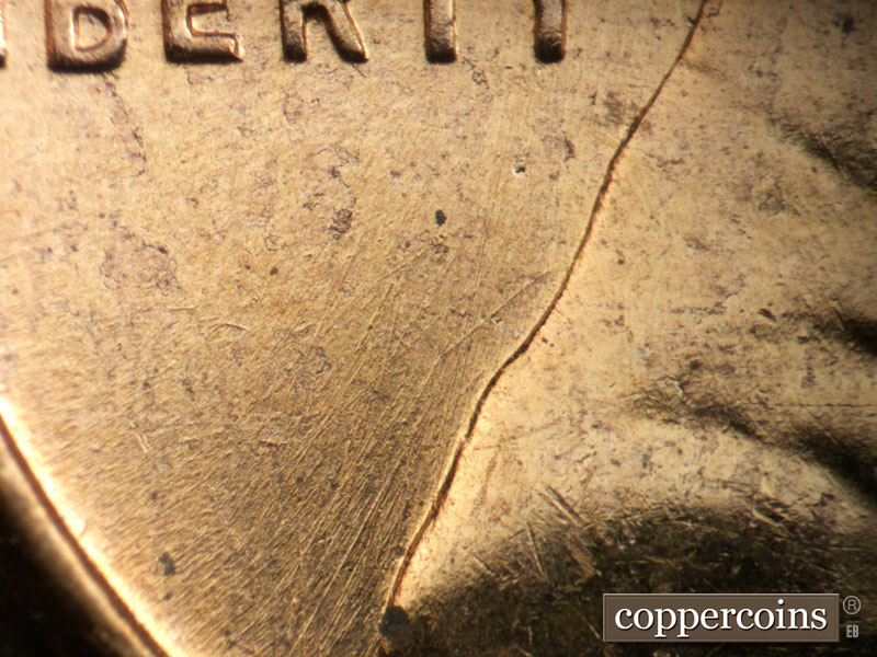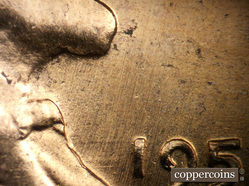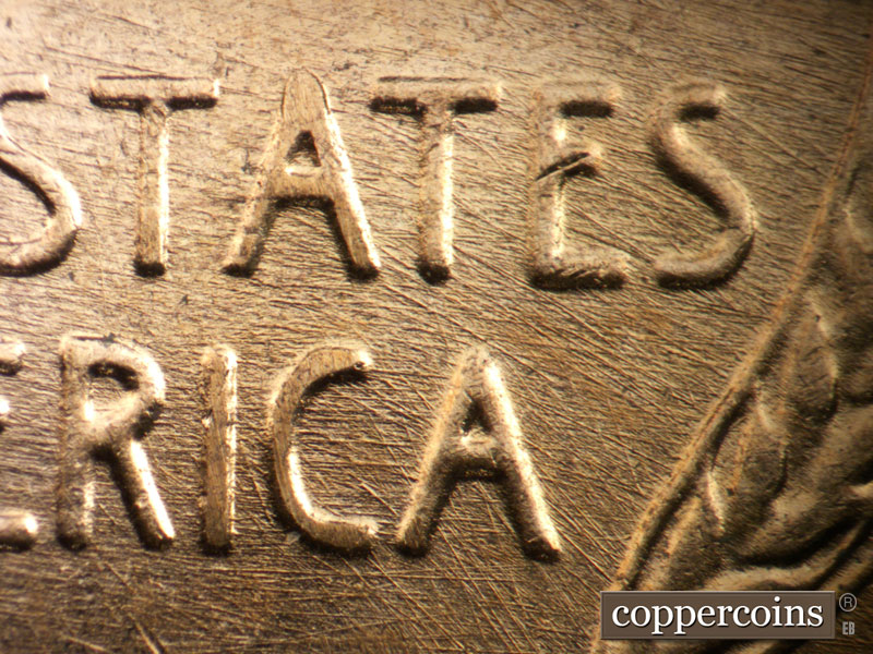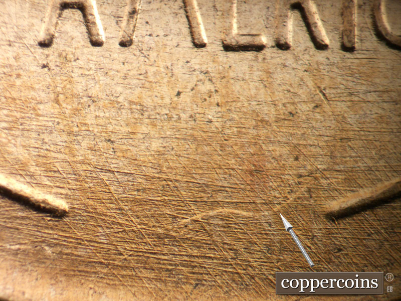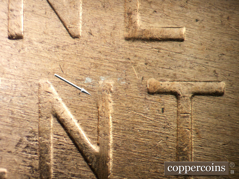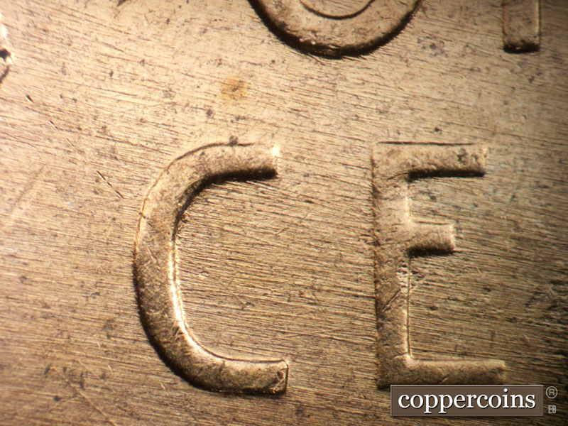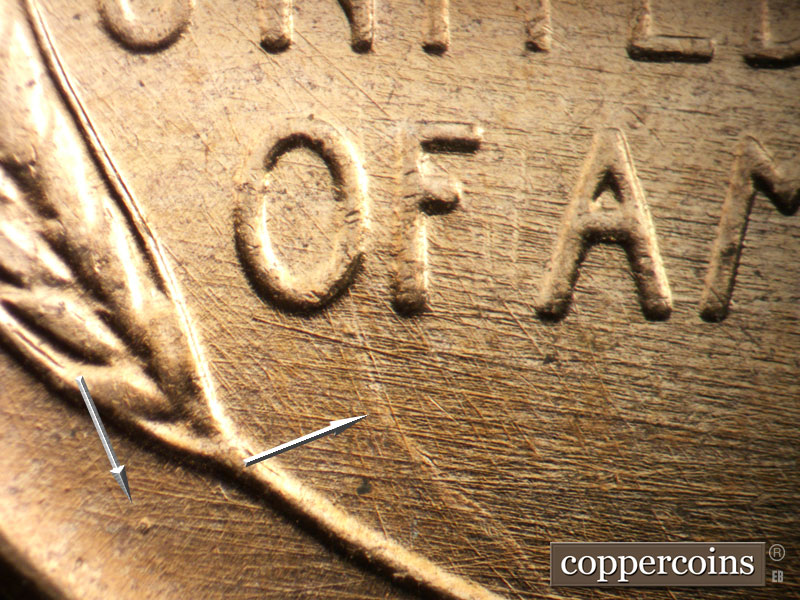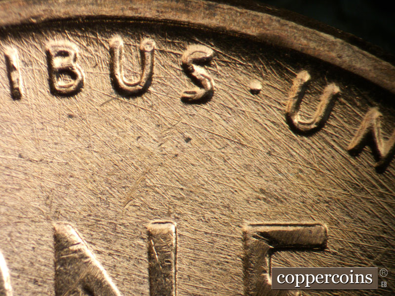 Crossing die scratches cover most of reverse, see photos for exact configuration. ESE die scratch through US in PLURIBUS. Die clash on N in CENT. Die clash from O in OF through wheat stem tips. Die dot between left wheat and rim.