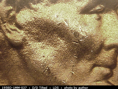 A die crack runs through the hair. A heavy die dot shows centered between the cheekbone and the jaw bone.
