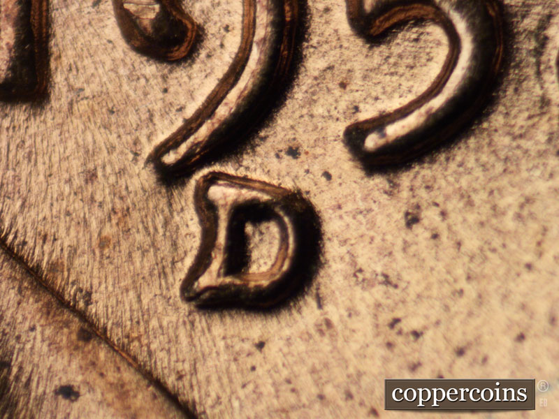 Shows as minor splits on both serifs. This mintmark is punched almost into the tail of the 9 of the date.
