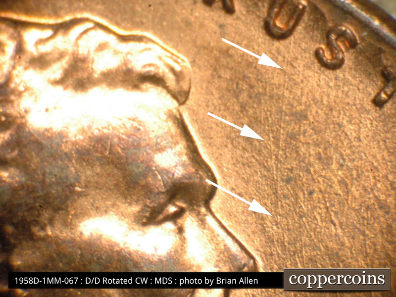 remnants of doubled die clash at throat and off vest directly left of the 1 in 1958. Long die scratches under TRUST extending south in front of nose; numerous circular die scratches in front of Lincolns profile.