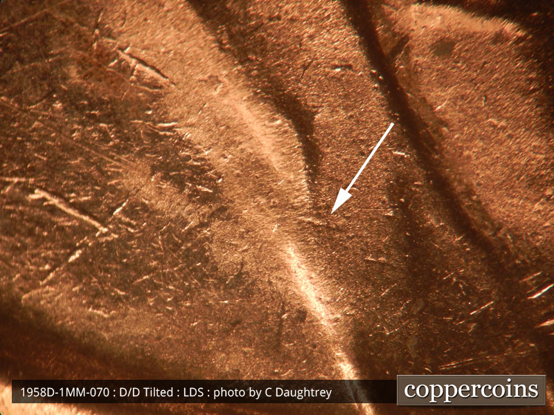 short die scratch in fold of armpit, die scratch connecting Y and back of collar, light die scratches through WE, die scratches in field under TRUST Reverse