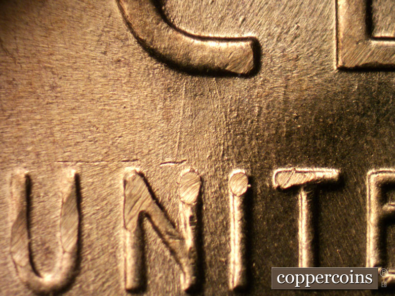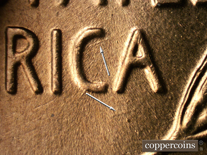 N/S die gouge between T in CENT and right wheat stalk. Die scratches from bottom of C in CENT. ENE die scratch from inside C in AMERICA. ESE die scratches inside first leg of N in ONE.