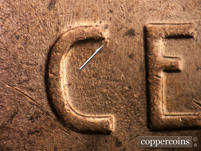 Short NE die scratch from tip of left wheat stalk. Die dot under N in UNITED and O in OF. Die chip from top of C in CENT.