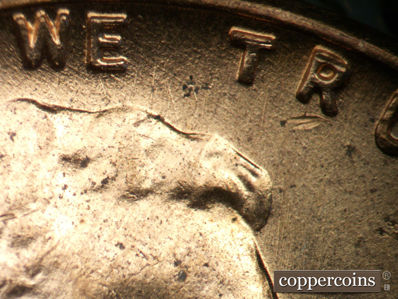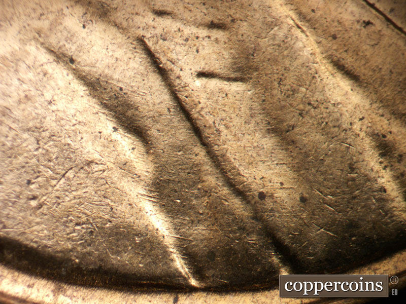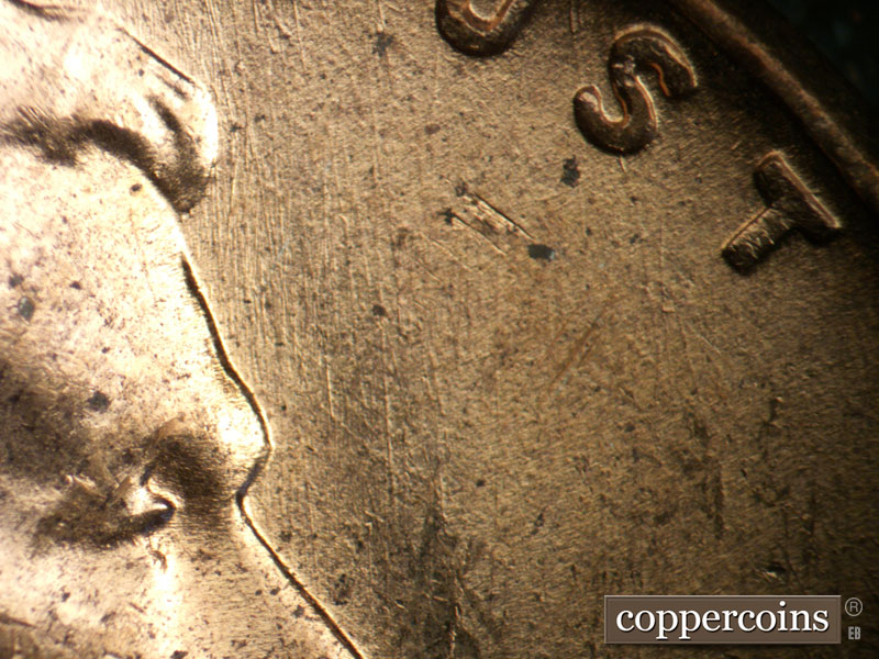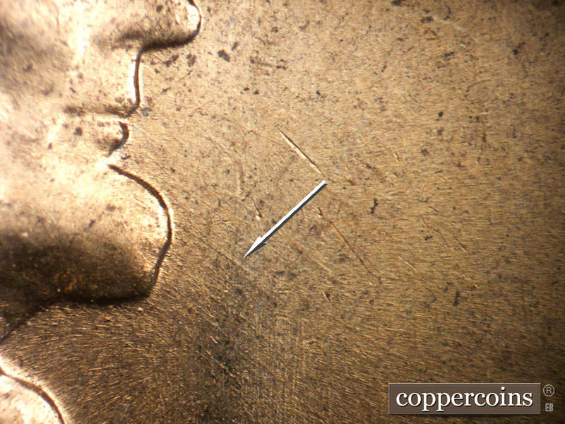 Generally N/S die scratches through date. Concentric die scratches on jacket and shoulder. Worn NW die scratches from back of neck. NW die scratches through WE. Generally N/S die scratches in field in front of forehead. Reverse is MDS