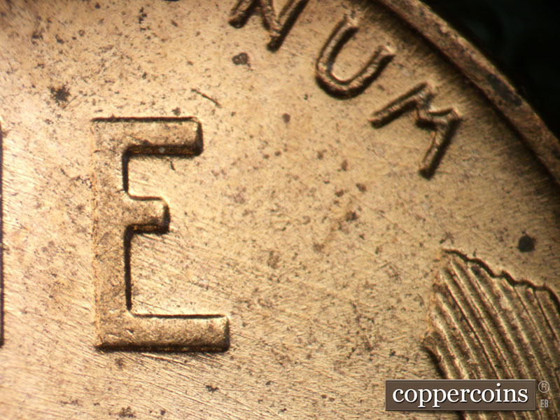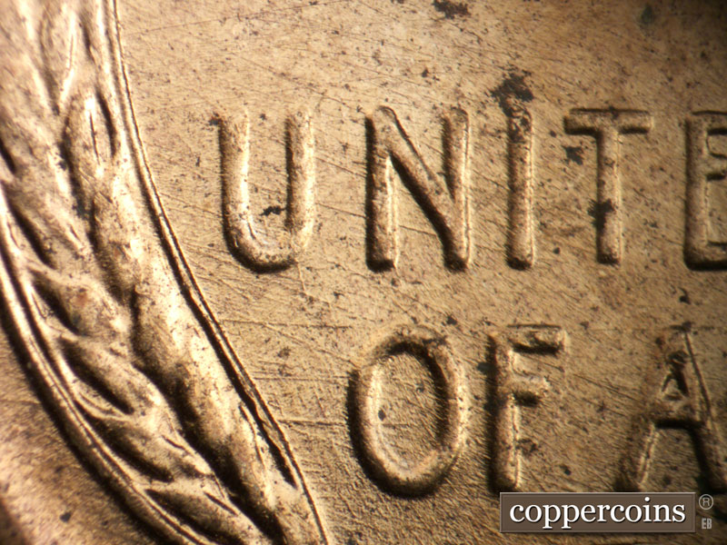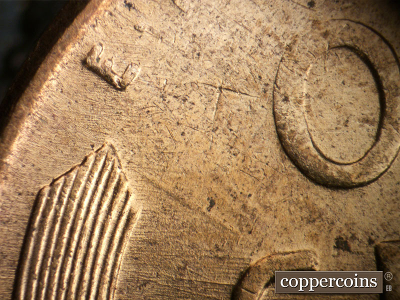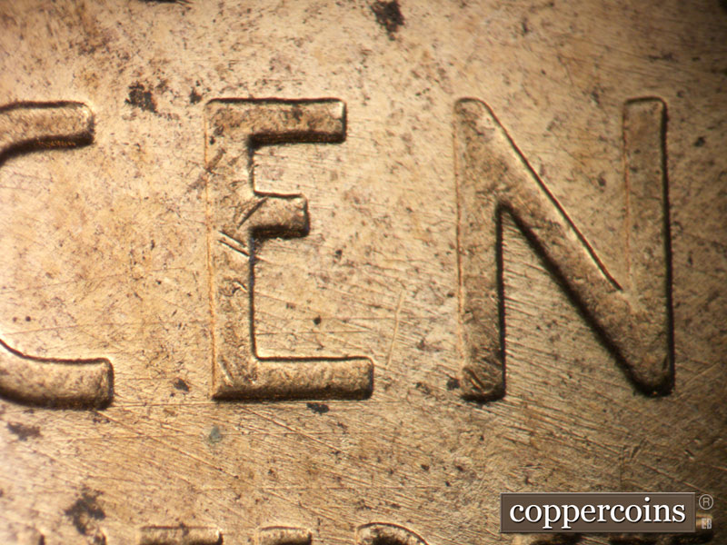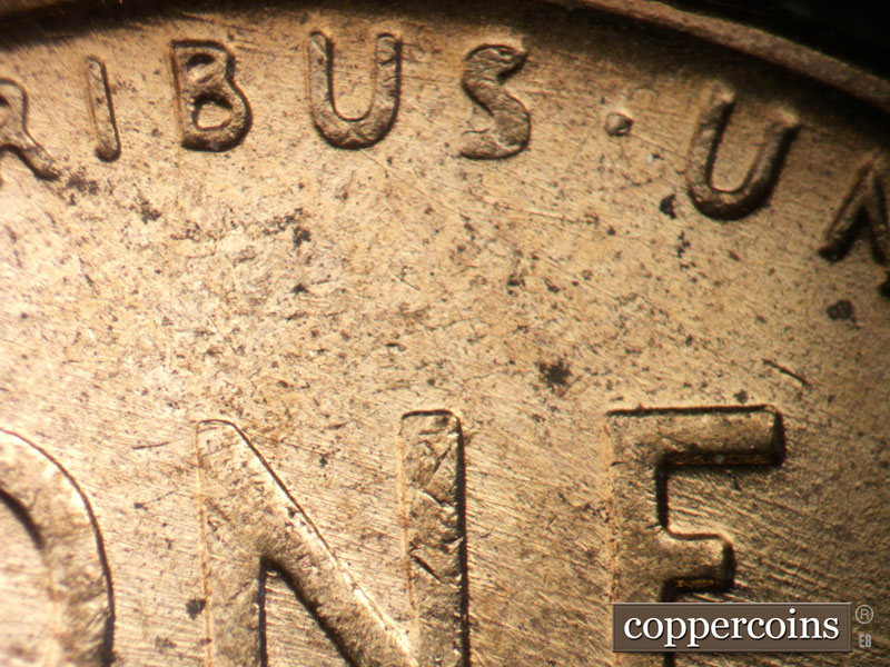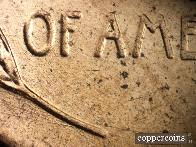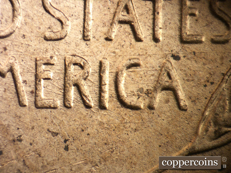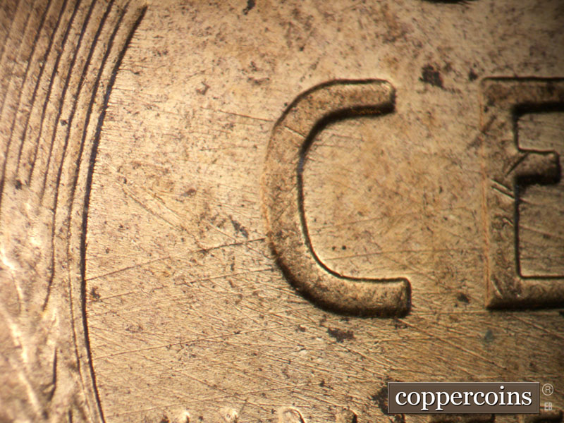 Generally ESE die scratches cover reverse, see photos for exact configuration. Heavy die scratches through AMERICA. E/W die scratch through CE in CENT.