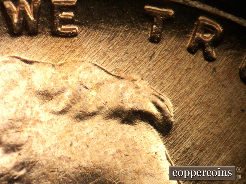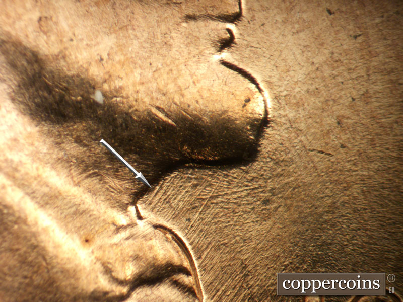 Die break on 9 in date. NE die scratch from top of R in LIBERTY. NE die scratches from forehead. Worn NE die scratches under nose. Worn NE die scratches under chin. Reverse is MDS