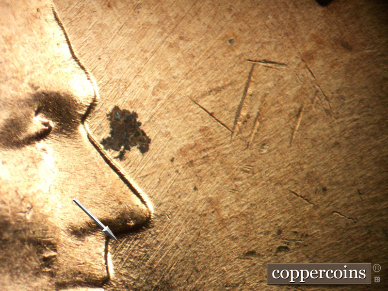 Generally NE die scratches cover obverse, see photos for exact configuration. ESE die scratches on jacket. NE die scratch fromn top of R in LIBERTY. NE die scratches under nose. NE die scratch under chin. Reverse is MDS