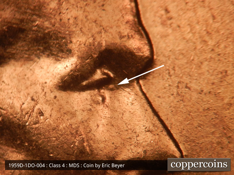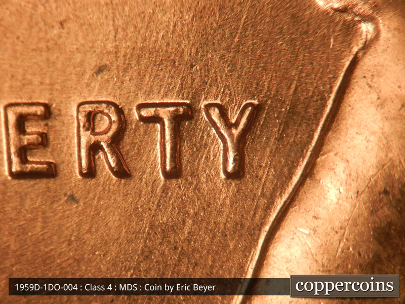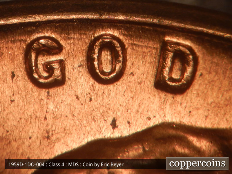 Obverse is paired with repunched mintmark 1959D 1MM-067 (doubled eye lid south), die scratches under chin, circular die scratches through GOD, short die scratch behind head, diagonal die scratches through TY of LIBERTY Reverse