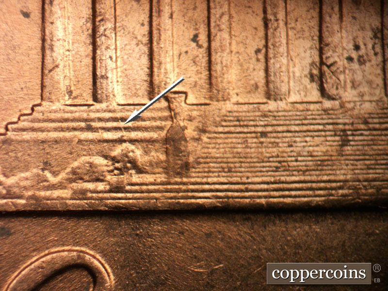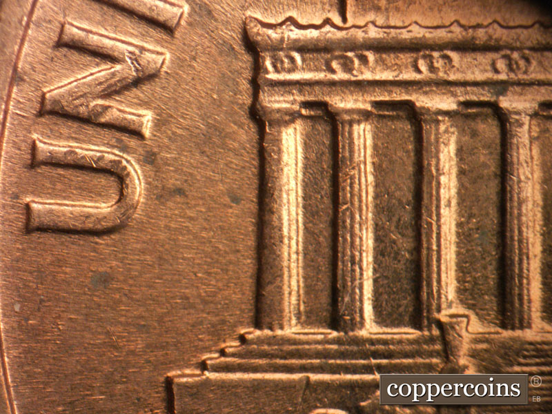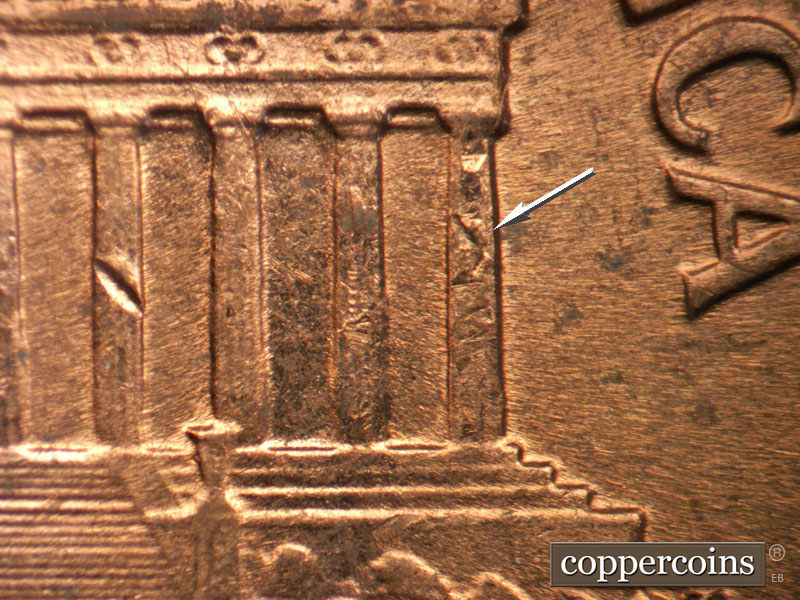 No die cracks or chips on columns. Small die break right cornice. Die gouge headed N from T in CENT