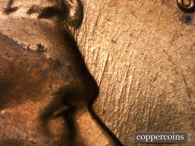 A N-S die scratch between the lower 1 and 9 of date. A series of die scratches under and to the west of the bust. Concentric die scratches on the lower lapel area.