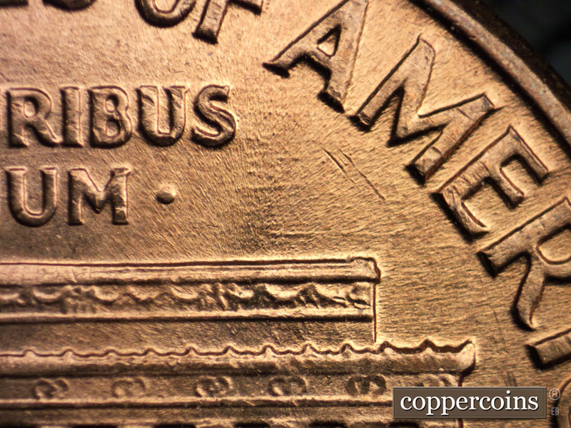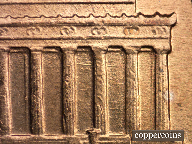 A heavier E-W die scratch through the upper 9th and 10th memorial bays. E-W die scratches above and to the right of the right roof line. Die scratches between the N and T of CENT. Reverse is MDS.